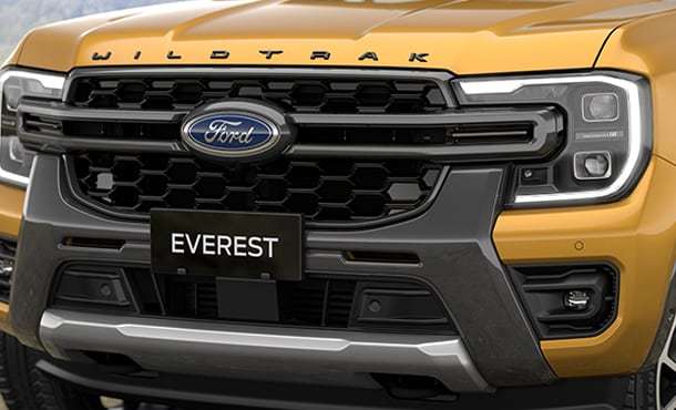 Phần đầu xe Everest Titanium đặc biệt nổi bật với lưới tản nhiệt dạng lưới mạ crôm kết hợp cùng cụm đèn LED hình chữ C mang đậm đặc trưng thiết kế toàn cầu của Ford. Các điểm nhấn mạ crôm trên gương, tay nắm cửa, bậc lên xuống hai bên xe tạo nên vẻ cứng cáp nhưng vẫn vô cùng sang trọng cho chiếc xe.