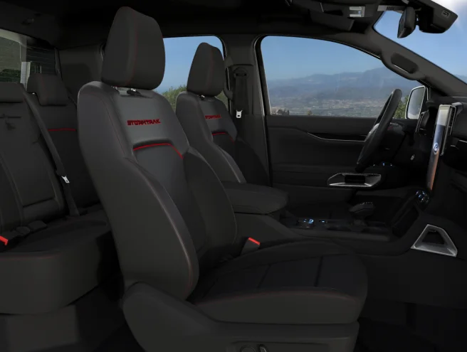 Nội thất Ranger Stormtrak mang thiết kế đặc trưng với tông màu đen kết hợp với đường chỉ đỏ tương phản, đặc biệt ghế da được thêu chữ “Stormtrak” màu đỏ cùng những công nghệ hiện đại trang bị trên xe giúp đáp ứng mọi nhu cầu của người lái.